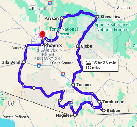 Vi får vara med på en underbar, klassisk ökensväng. Uppe på bergen över Payson till Show Low. Ner genom kullar, sten och träd till Tuscon och lite cowboy-civilization. Tombstone, Bisbee och vidare till gränsbyn Nogales AZ. Ut igen genom den tomma, dallrande öknen och upp till Gila Bend, känd för, ja, inte mycket. Detta kanske bättras på då vi har lämnat byn bakom oss? Gila Bend till Scottsdale för två nätter R n’ R nära festliga Old Town. Poolhäng, pubcrawl. GOD mat, lyxa till sig lite.